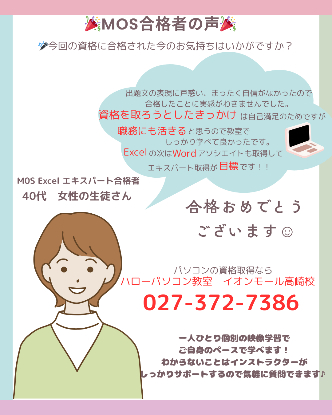 本日はMicrosoftOfficeSpecialist(通称MOS)の合格者の方のお声をご紹介します。