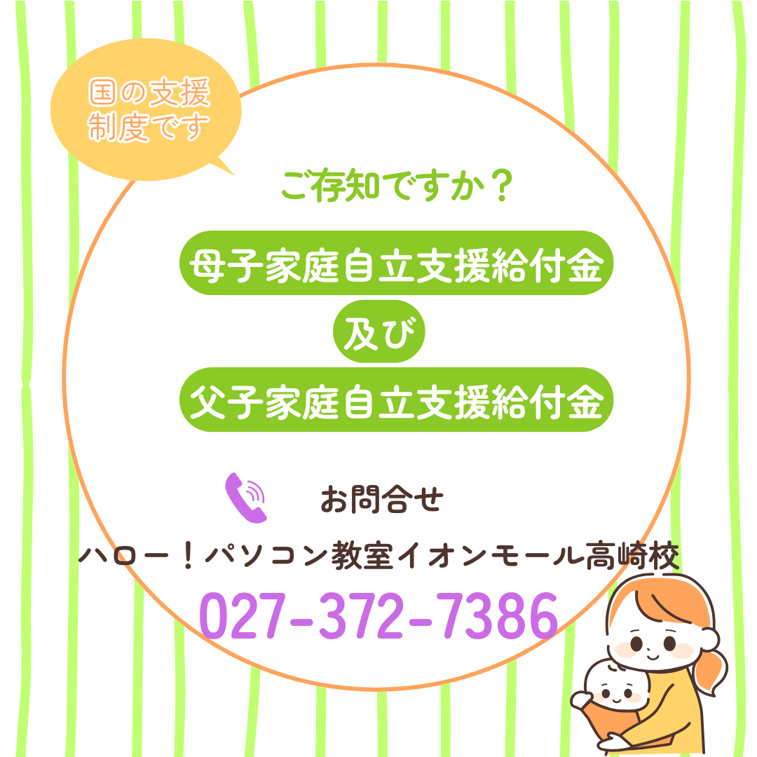 厚生労働省の支援制度で、ひとり親の方に向けパソコンの資格取得やスキルアップにかかる費用の一部が補助される制度です。