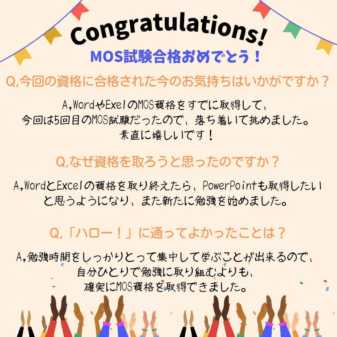 今回は、MOS 2019 PowerPoint試験で満点合格を果たした40代女性の生徒さまの合格体験記をご紹介します!